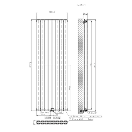 BELRAD Verticale designradiator dubbelzijdig 1800x608mm - Zwart - Middenaansluiting - 2164W